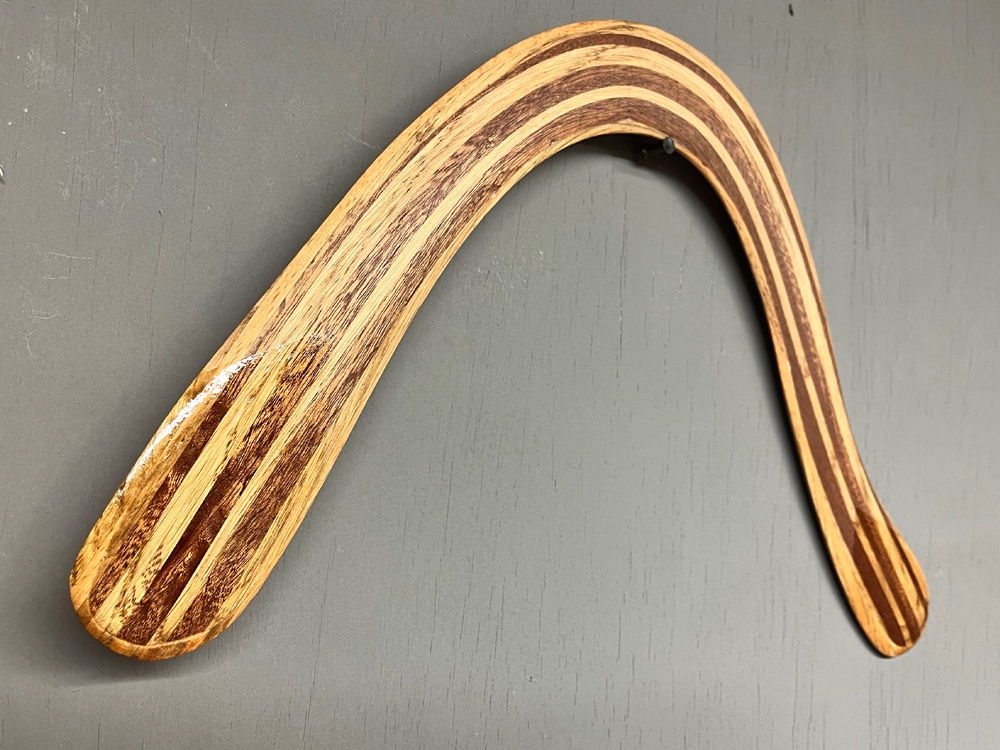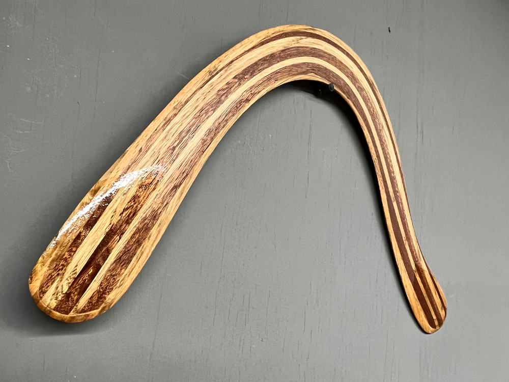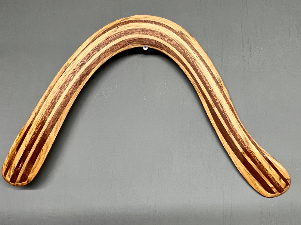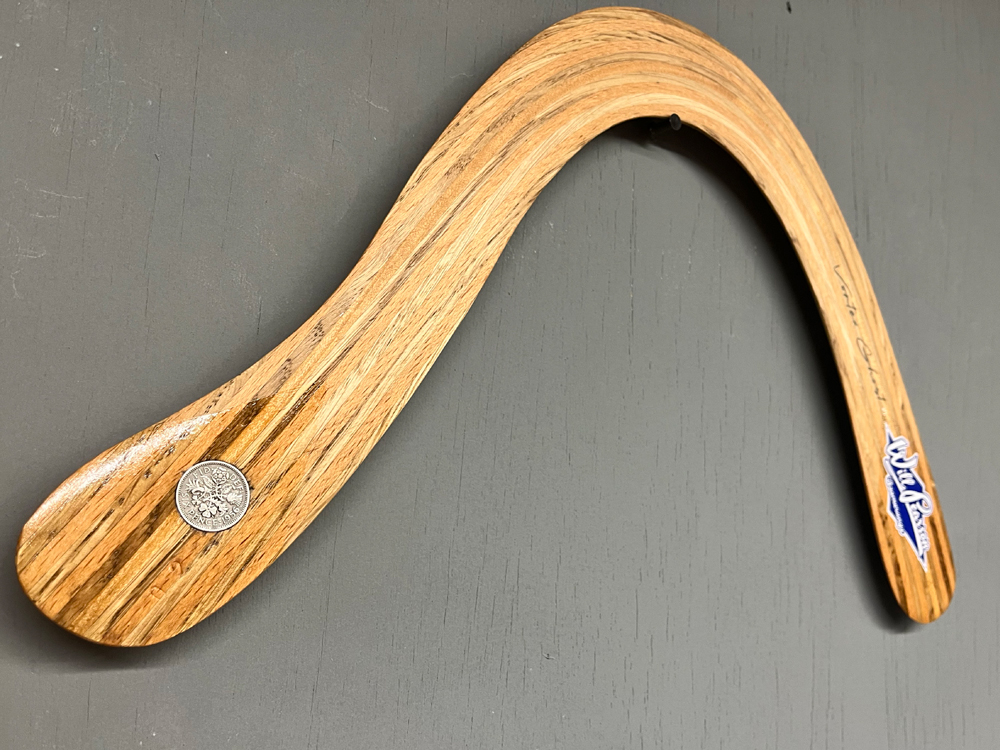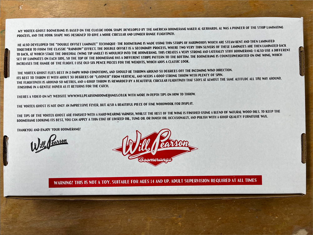 Based on Al Gerhards boomerang designs the Vortex Ghost takes full advantage of our wood laminating techniques. Double offset laminated wood strips shaped at time of lamination give the Vortex Ghost strong built in Dihedral. the layered wood laminations make it a tough and durable throw with a reliable 50m flightpath and consistent altitude. Counterweighted with an english 1940/50s sixpence piece, the Vortex Ghost is a stylish and high performing piece, that is made with a healthy dose of nostalgia for times past.