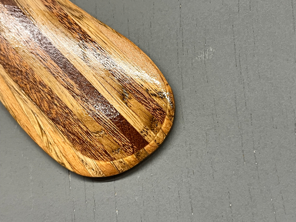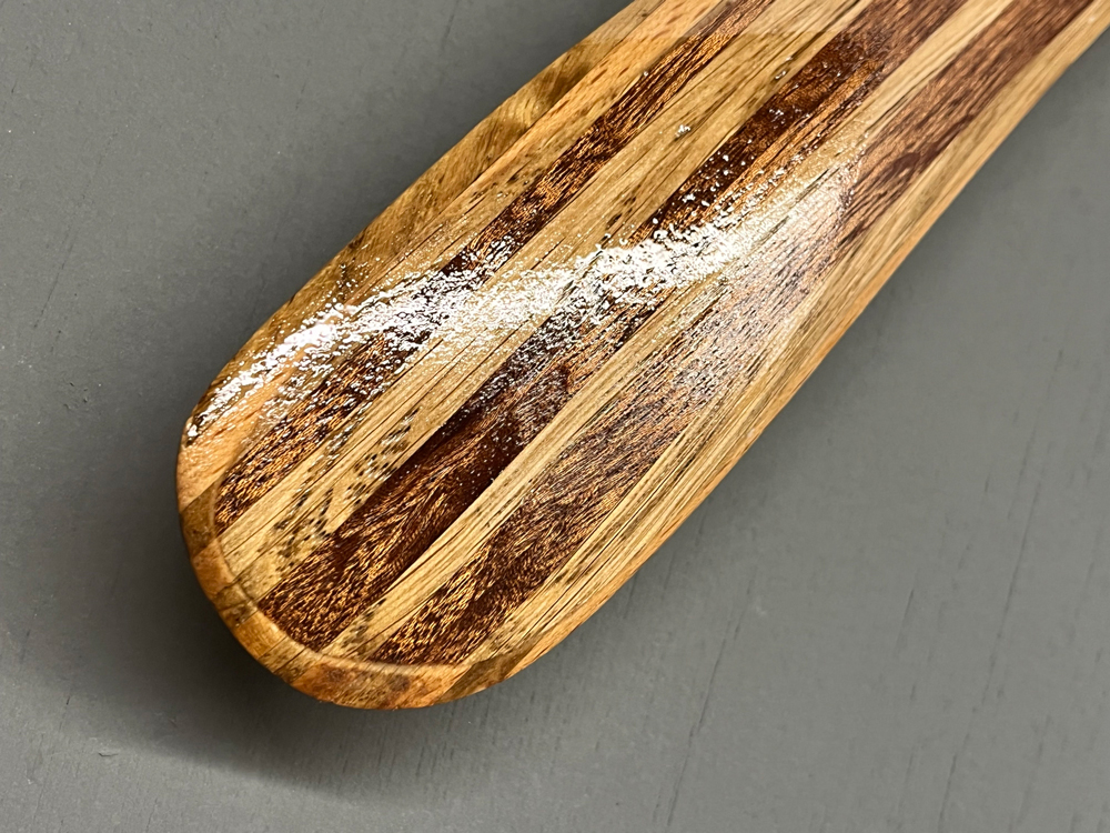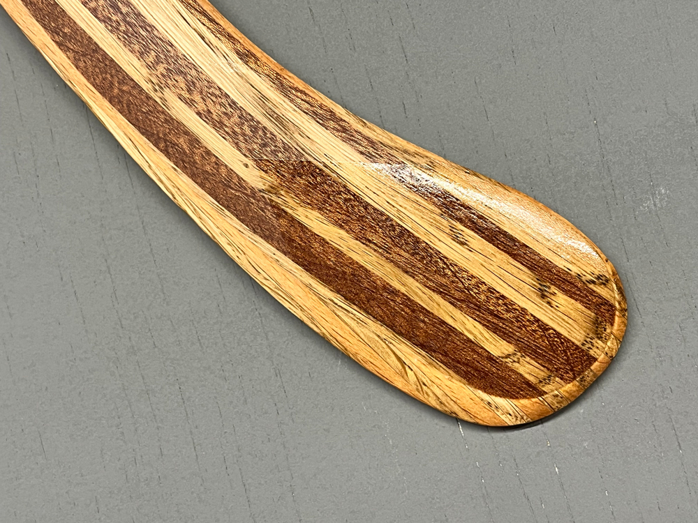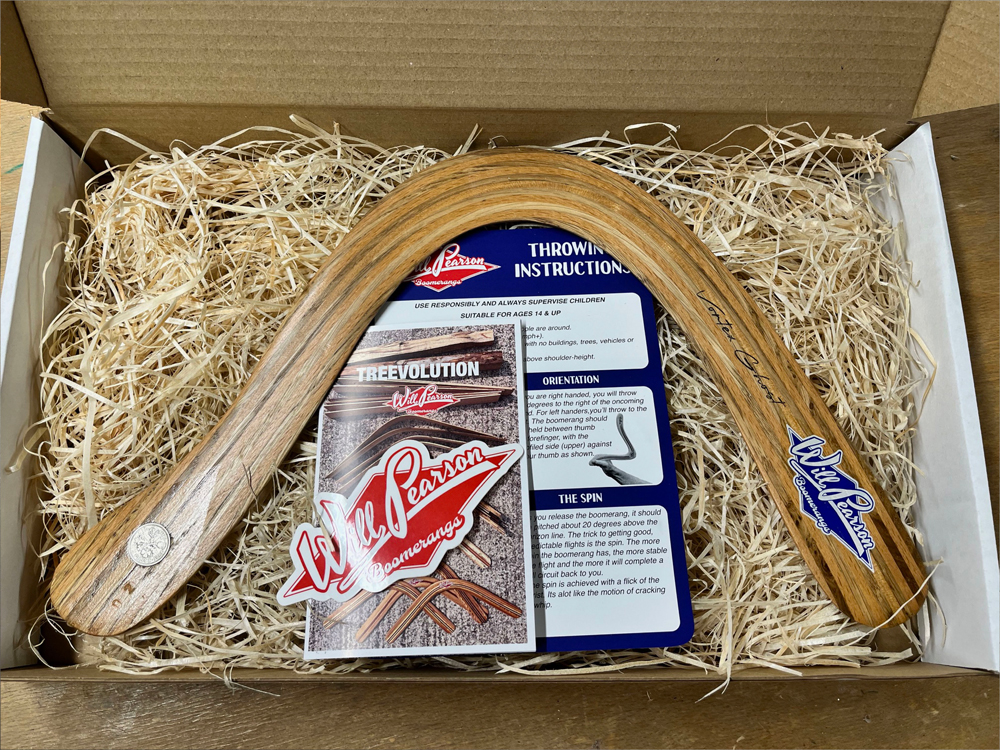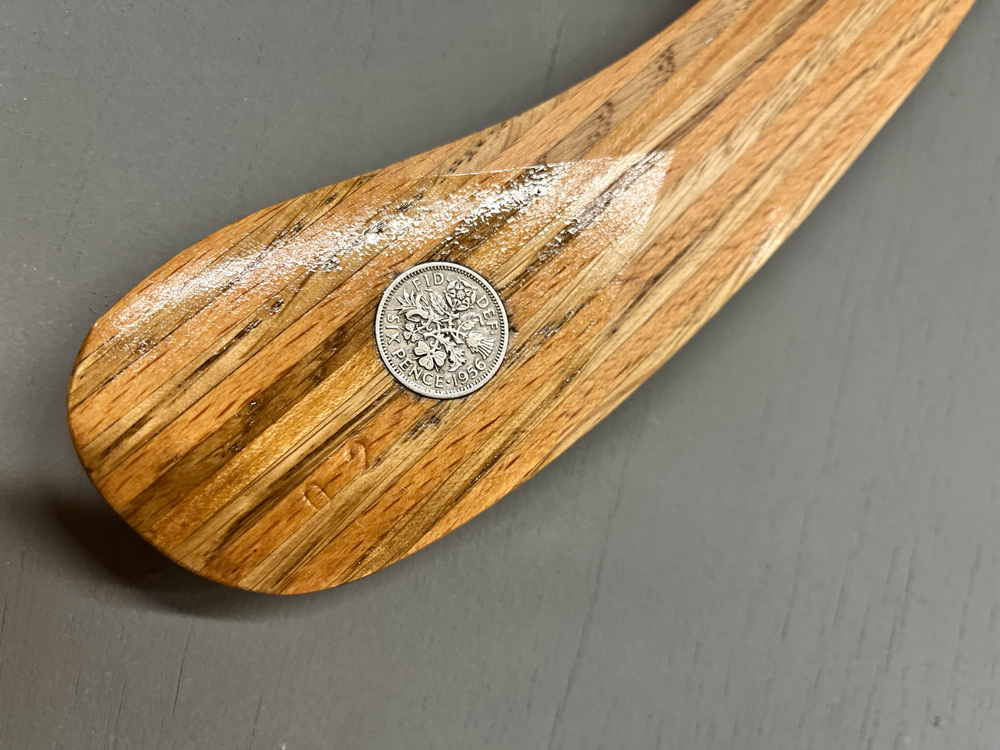 Based on Al Gerhards boomerang designs the Vortex Ghost takes full advantage of our wood laminating techniques. Double offset laminated wood strips shaped at time of lamination give the Vortex Ghost strong built in Dihedral. the layered wood laminations make it a tough and durable throw with a reliable 50m flightpath and consistent altitude. Counterweighted with an english 1940/50s sixpence piece, the Vortex Ghost is a stylish and high performing piece, that is made with a healthy dose of nostalgia for times past.
